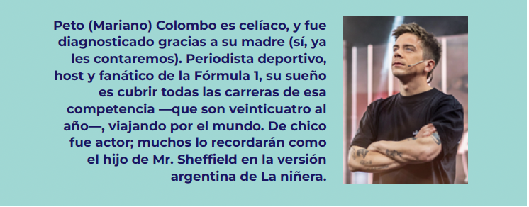 Peto (Mariano) Colombo es celíaco, y fue diagnosticado gracias a su madre (sí, ya les contaremos). Periodista deportivo, host y fanático de la Fórmula 1, su sueño es cubrir todas las carreras de esa competencia —que son veinticuatro al año—, viajando por el mundo. De chico fue actor; muchos lo recordarán como el hijo de Mr. Sheffield en la versión argentina de La niñera.